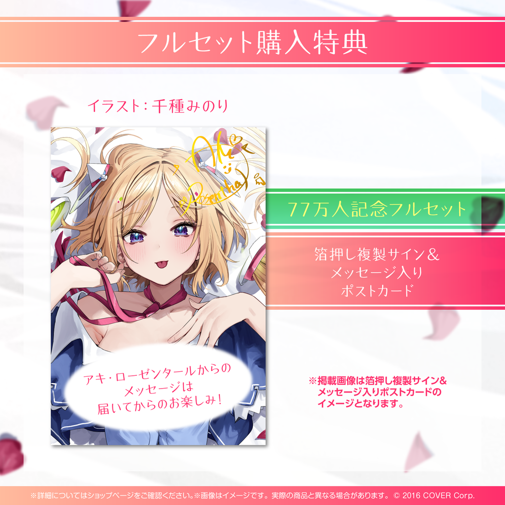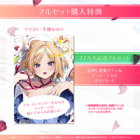 ・Bonus: Postcard with a duplicated foil-stamped autograph and message from Aki Rosenthal. (Illustration: 千種みのり)