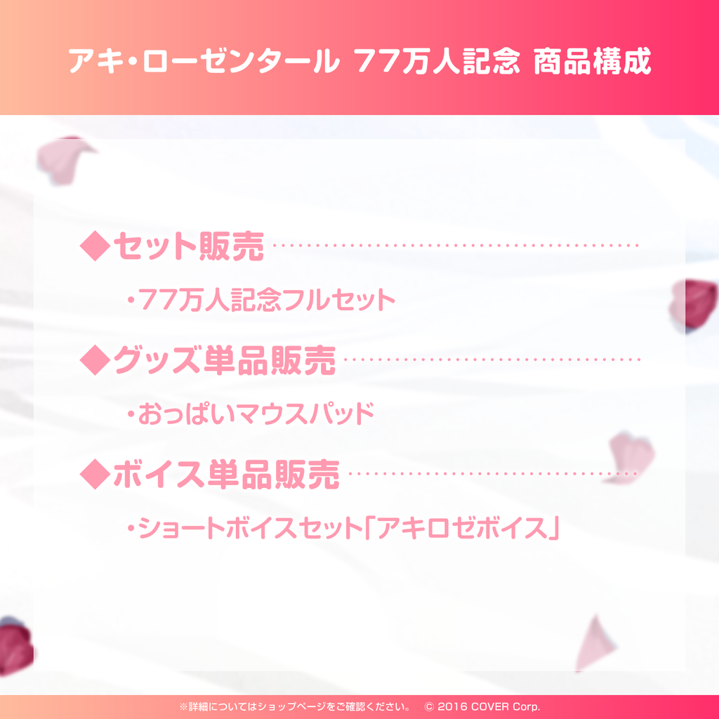 Shipping Period:Estimated around early-May to early-June 2024.The merchandise sales for the 770K subscribers celebration of Aki Rosenthal from hololive.