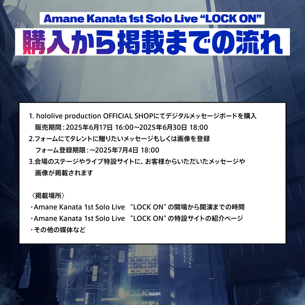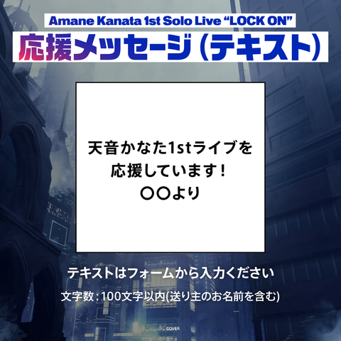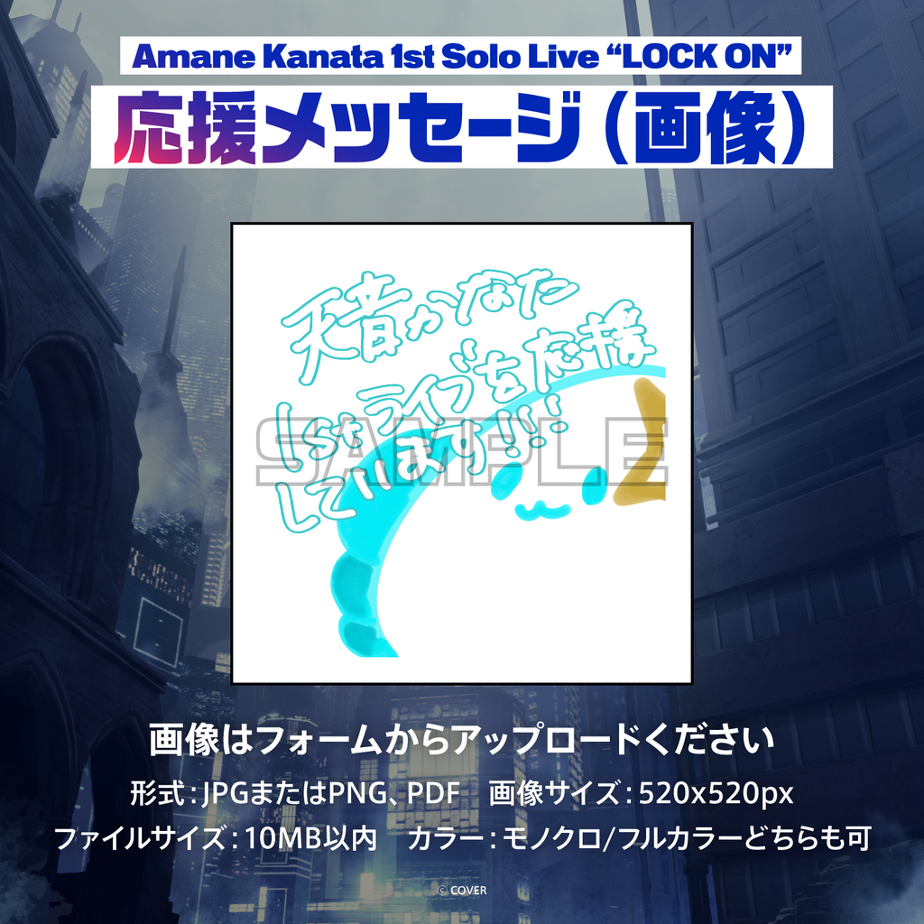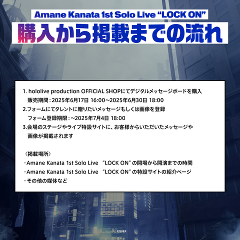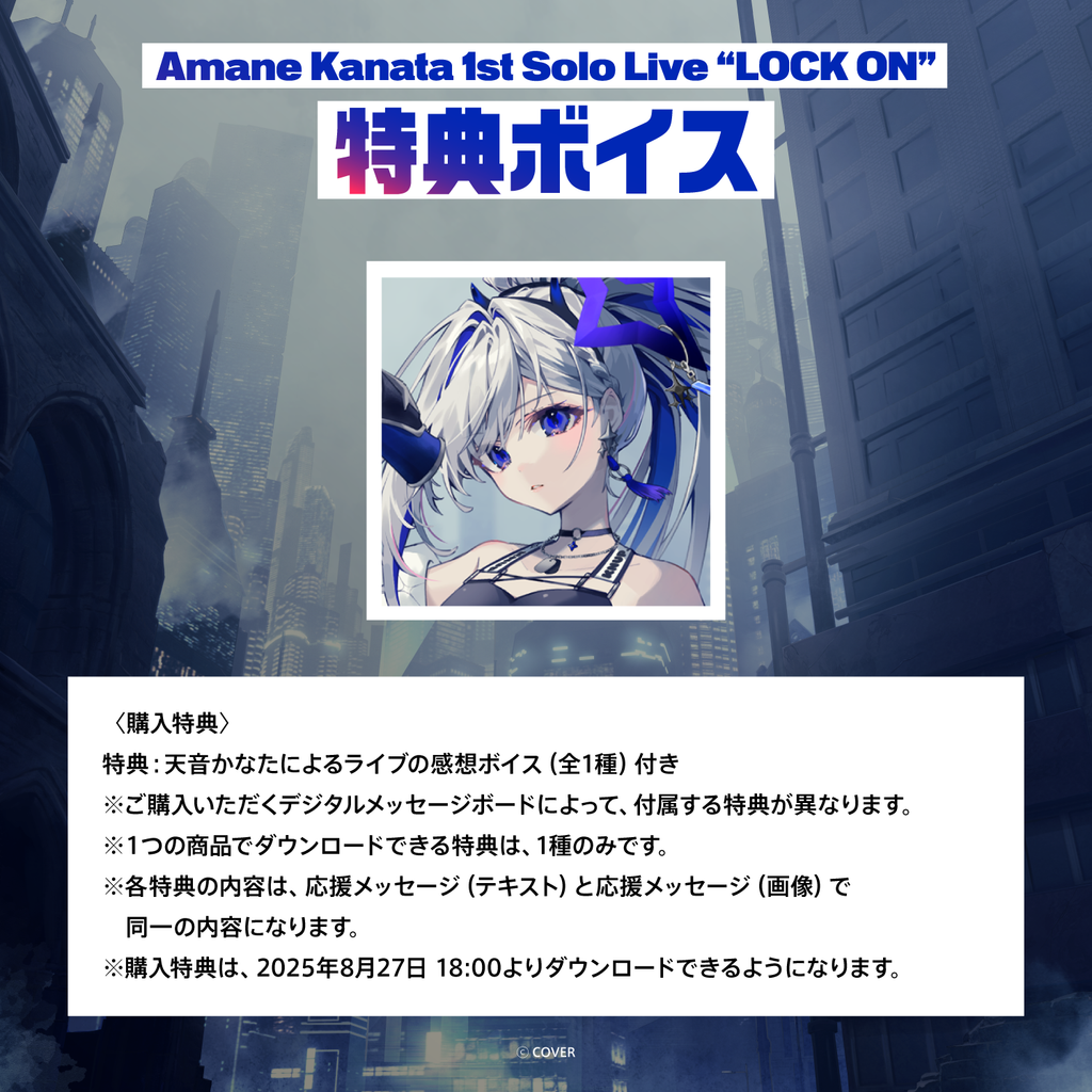 Shipping Period:購入特典は、2025年8月27日 18:00よりダウンロードできるようになります。Digital Message Board submissions are available for sale, allowing fans to support talent appearing at Amane Kanata 1st Solo Live “LOCK ON” on August 13, 2025 (JST).
