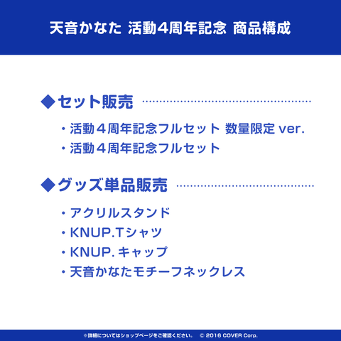 This is the limited edition of the complete set of merch items to celebrate the 4th anniversary of Amane Kanata.
