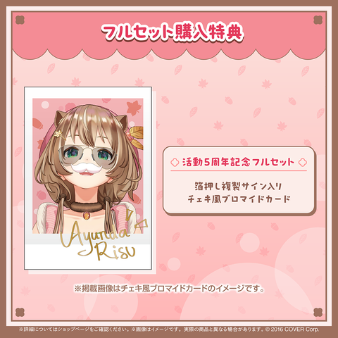 ・Bonus: Cheki-style bromide card with a duplicated foil-stamped autograph from Ayunda Risu.