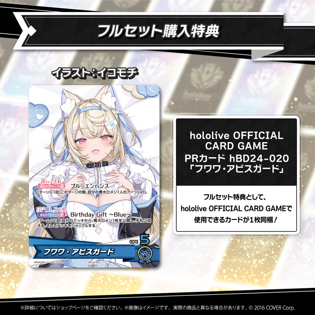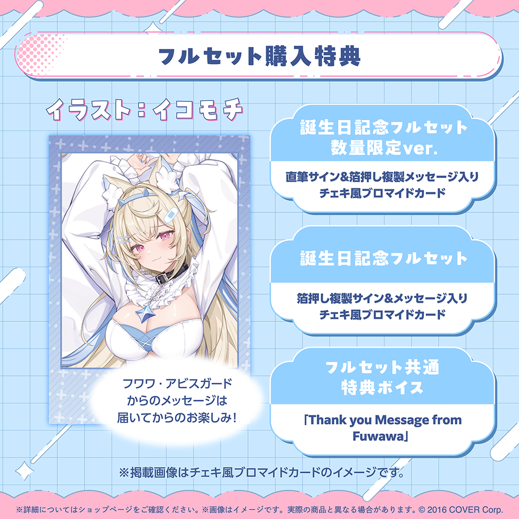 ・Bonus: Cheki-style bromide card with a handwritten autograph and duplicated foil-stamped message from Fuwawa Abyssgard. (Illustration: イコモチ)