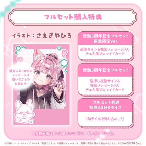 ・ Bonus: Cheki-style bromide card with a handwritten autograph and a duplicated message from Hakui Koyori. (Illustration: さえきやひろ)