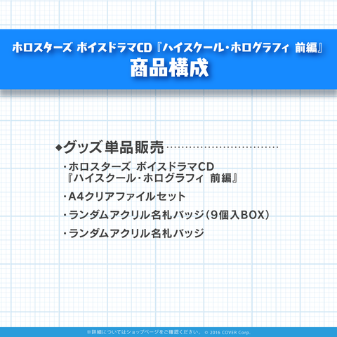 Shipping Period:After payment confirmation, your order will be shipped within 7 business days for addresses within Japan and 15 business days for addresses outside Japan.The merch sales of the first original voice drama CD of HOLOSTARS, "High School Holography Vol. 1".