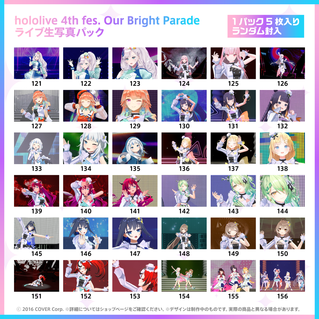 In honor of the Blu-ray release of hololive 4th fes. Our Bright Parade, which was held on March 18th-19th, 2023, we will be releasing commemorative concert photo packs.
