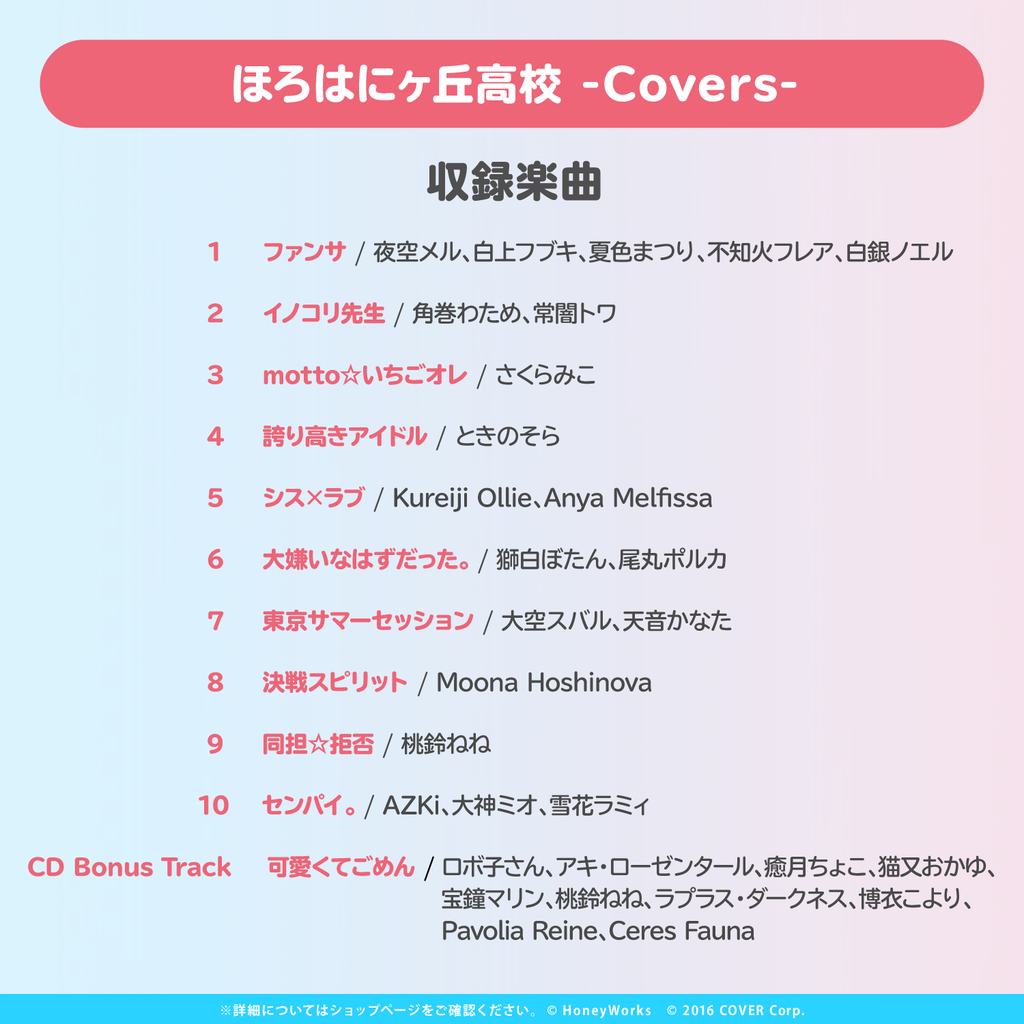 "Holohoneygaoka High School -Covers-", on the other hand, highlights the charm of hololive into eleven cover versions of HoneyWorks' famous songs, offering a different take from the original compositions.