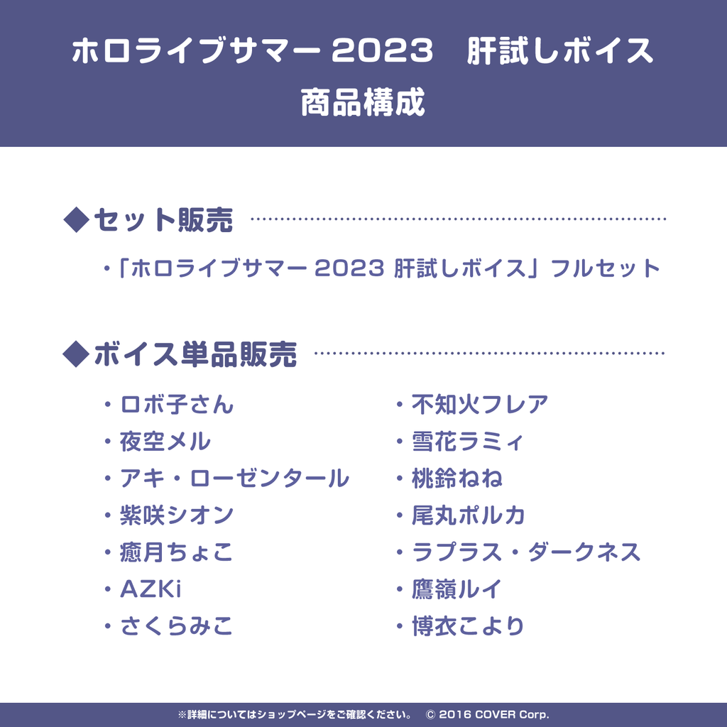 Shipping Period:Generally, the voice packs you purchase will be reflected on your ‘My Account’ page immediately after you complete the order.Please share with us your thought about the voice under the hashtag "#ホロライブ肝試しボイス"!