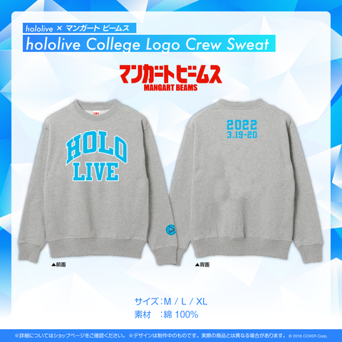 「hololive」の文字をファッションの定番アイテムであるカレッジスウェット風に仕上げました。ボロボロになるまで着古してほしいアイテムです。フロントはホロライブのロゴカラーを採用、バックは今回のライブの日付を入れております。ライブではもちろん、街中にも溶け込むデザインに仕上がりました。