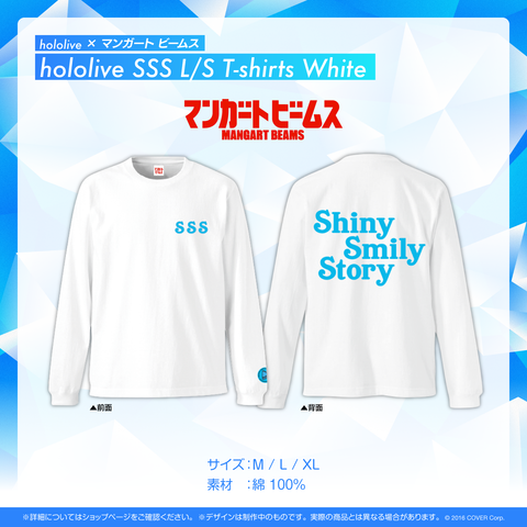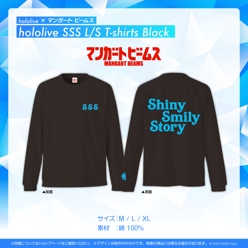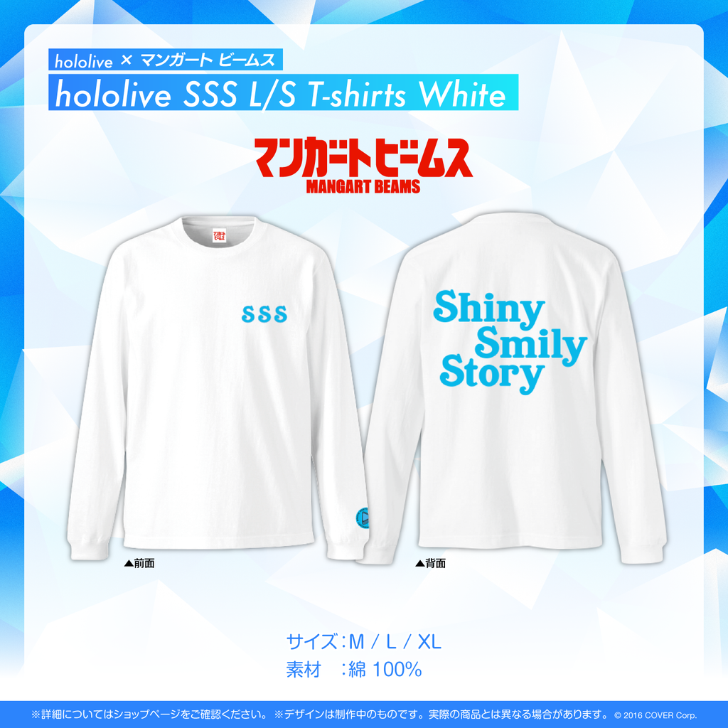 「hololive」公式曲第一弾「Shiny Smily Story」に感銘を受け、フロントはそれぞれの頭文字を取った「SSS」、バックにはタイトルをMANGART BEAMSらしい軽やかさのあるグラフィックに落とし込みました。ライブではもちろん、街中にも溶け込むデザインに仕上がりました。
