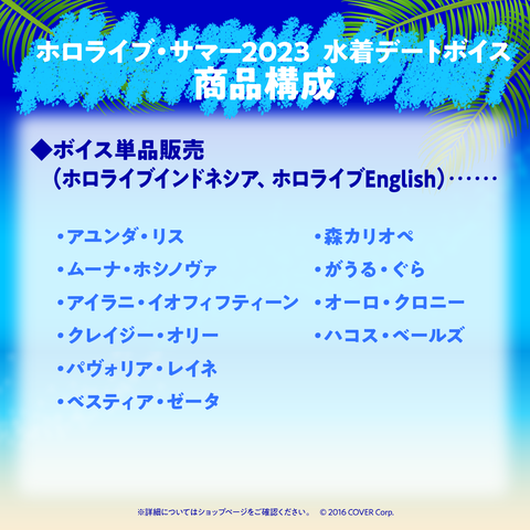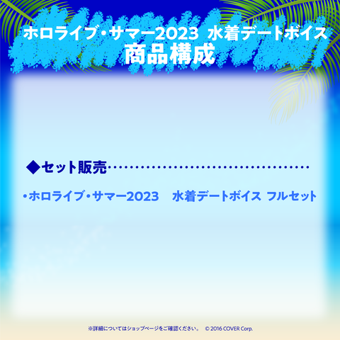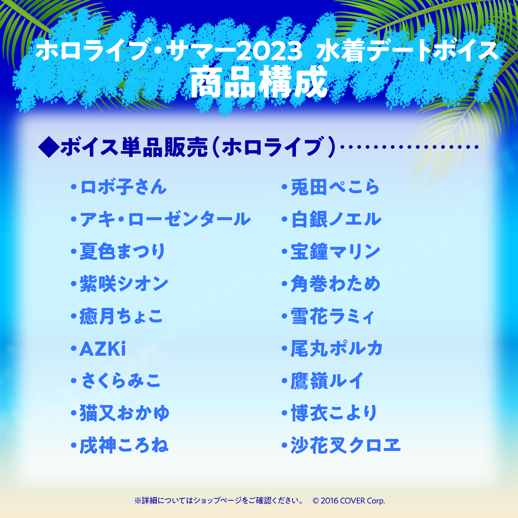 Shipping Period:Generally, the voice packs you purchase will be reflected on your ‘My Account’ page immediately after you complete the order.A set of situation voices recorded by hololive talents with the concept of "Swimsuit Date".