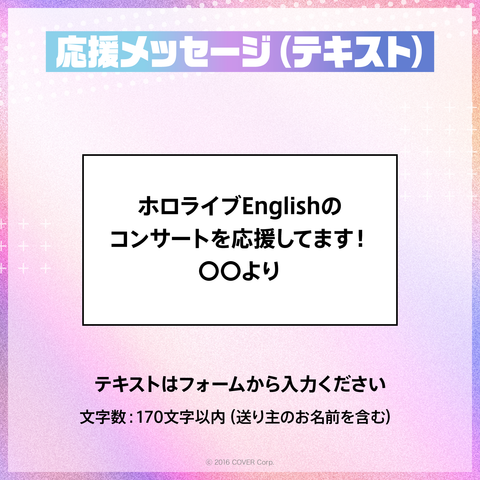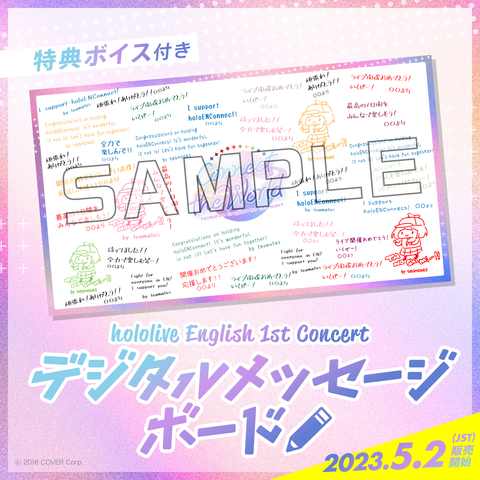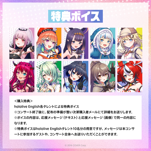 ※特典ボイスはhololive Englishタレント10名分の用意ですが、メッセージは本コンサートに参加するゲストや、コンサート全体へお送りいただくことができます。