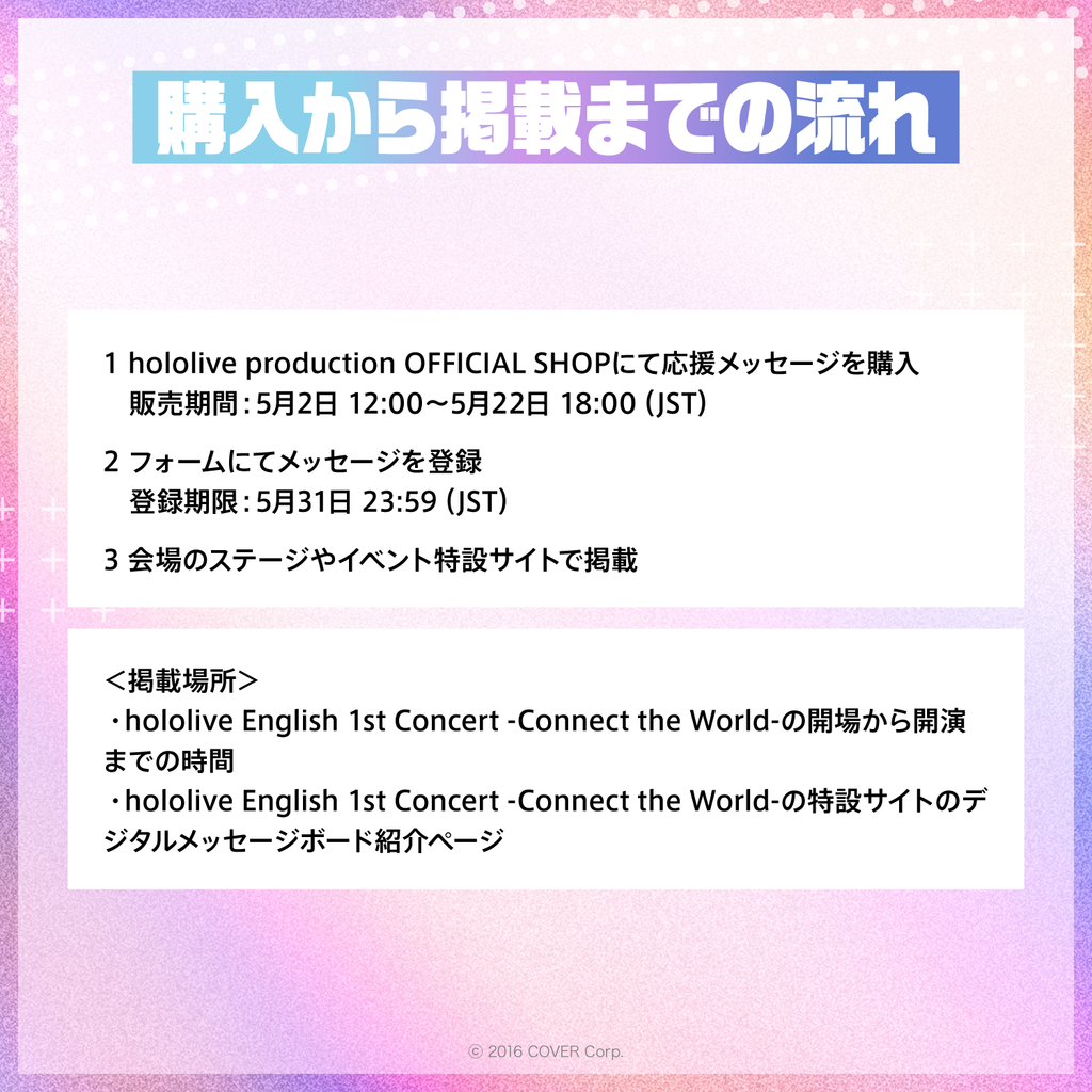 Digital message boards are now available where you can send your messages of support to the talents performing at "hololive English 1st Concert -Connect the World-", taking place on July 2nd, 2023 (PDT).
