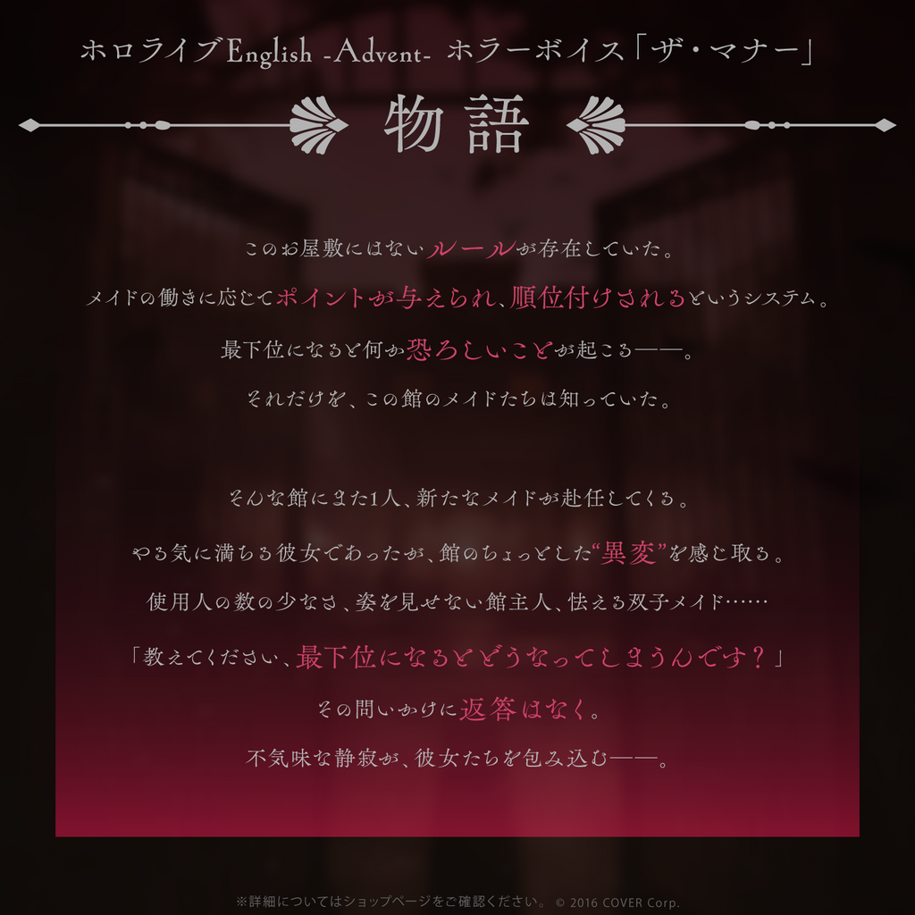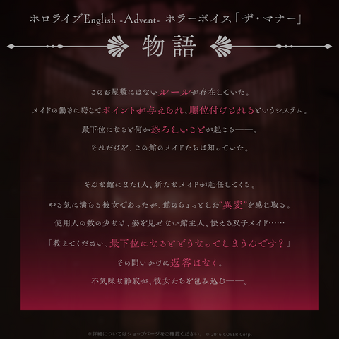 Shipping Period:Generally, the voice packs you purchase will be reflected on your ‘My Account’ page immediately after you complete the order.The "Horror" themed episode voices, recorded by hololive production VTubers.