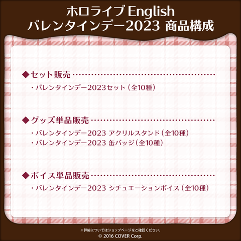 Shipping Period:Generally, the voice packs you purchase will be reflected on your ‘My Account’ page immediately after you complete the order.The Valentine's Day merchandise sales of hololive English.