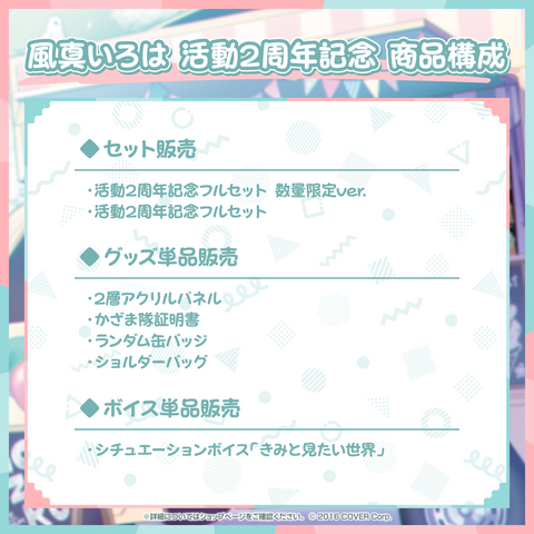 This is the limited edition of the complete set of merch items to celebrate the 2nd anniversary of Kazama Iroha.