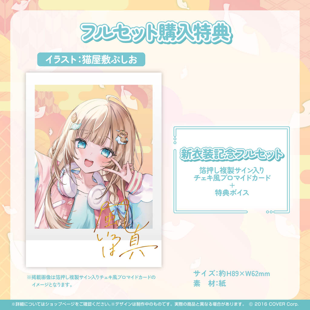 ・Bonus: Polaroid-style bromide card with a duplicated foil-stamped autograph from Kazama Iroha. (Illustration: 猫屋敷ぷしお)