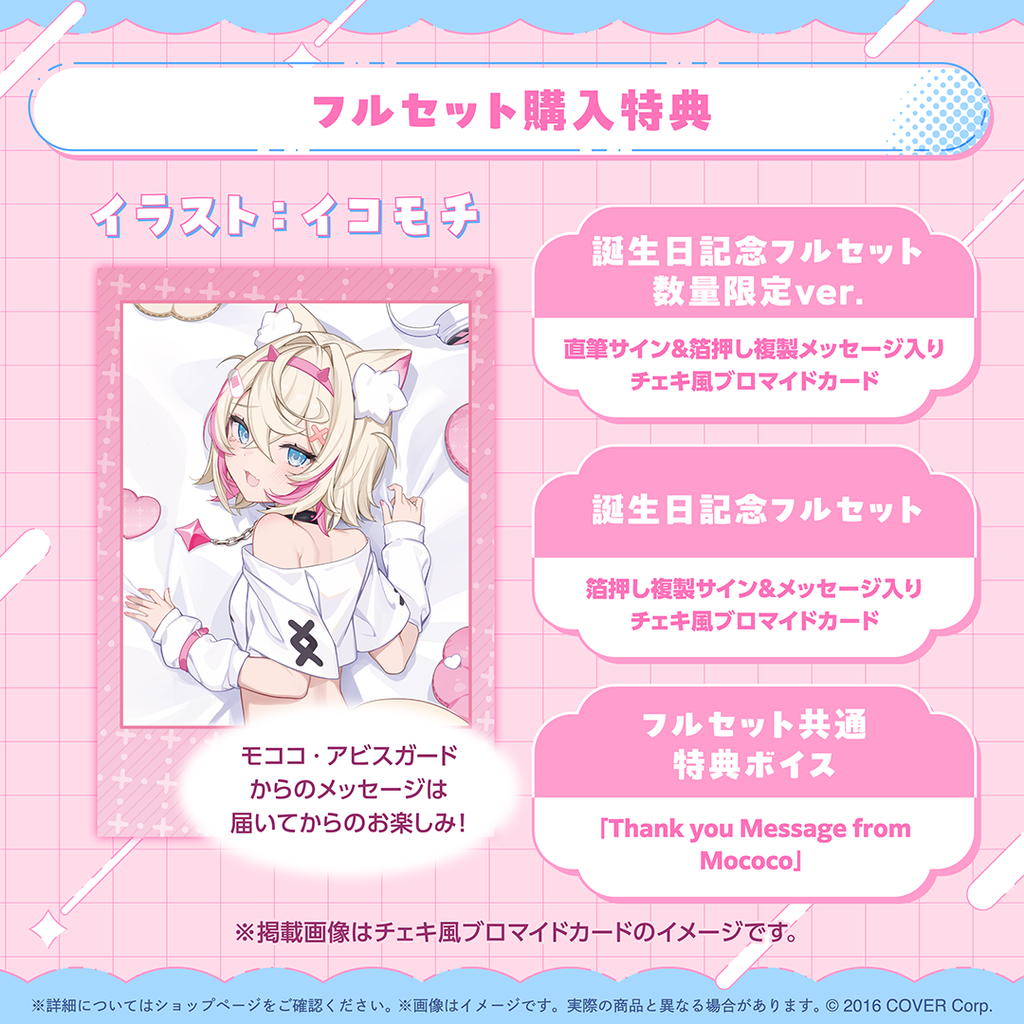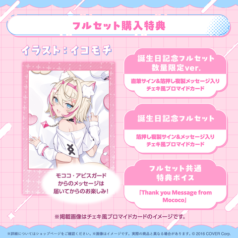 ・Bonus: Cheki-style bromide card with a handwritten autograph and duplicated foil-stamped message from Mococo Abyssgard. (Illustration: イコモチ)