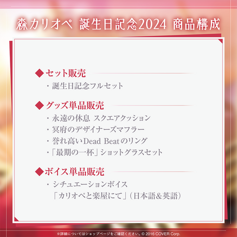 Shipping Period:Estimated around early September to early October 2024.The merchandise sales for the birthday celebration of Mori Calliope from hololive English.