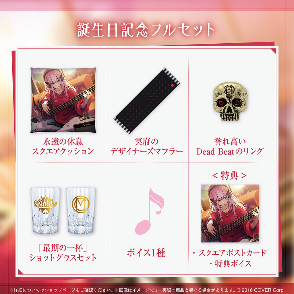 This is the complete set of merch items to celebrate the birthday of Mori Calliope.