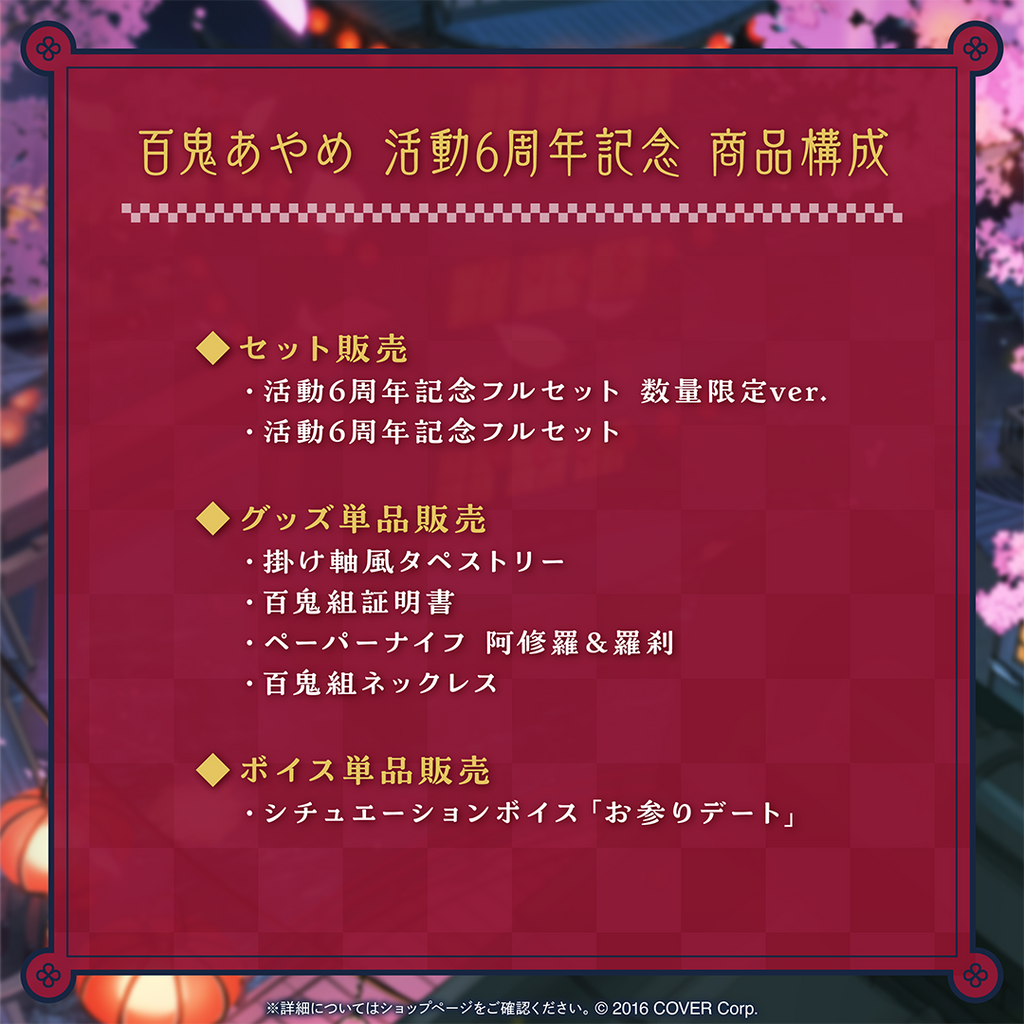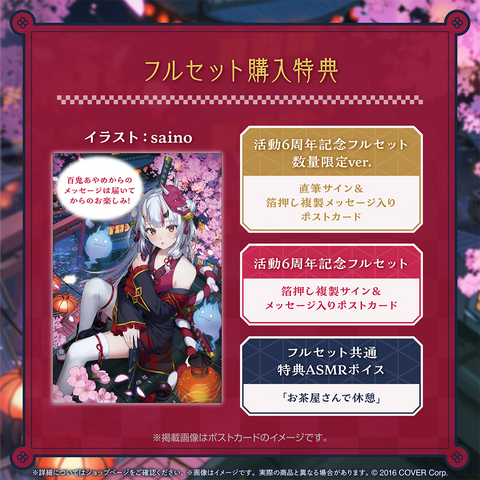 This is the limited edition of the complete set of merch items to celebrate the 6th anniversary of Nakiri Ayame.