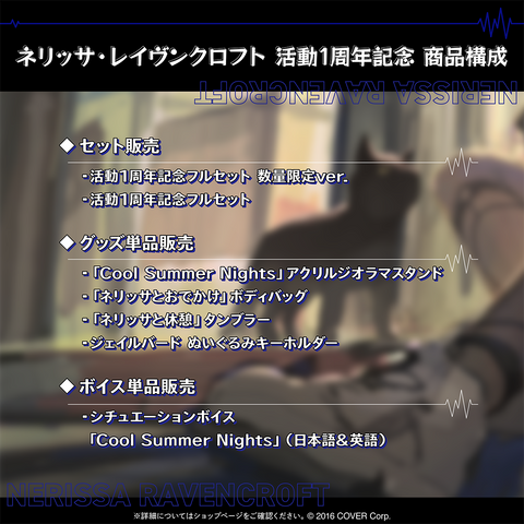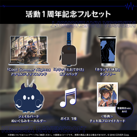 This is the limited edition of the complete set of merch items to celebrate the 1st anniversary of Nerissa Ravencroft.