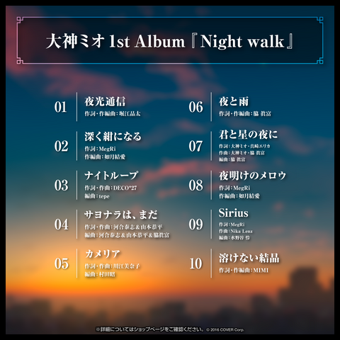 大神ミオ本人作詞作曲の楽曲「君と星の夜に」を始めとした、「夜」をテーマとした楽曲が収録されたファン待望の1st Album。豪華著名作家からの書き下ろし新曲も収録。