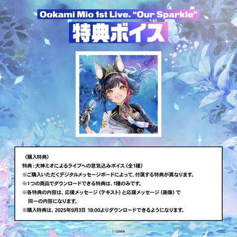 As a special bonus with each purchase, you will be able to download a voice recording from Ookami Mio starting September 3, 2025, 18:00 (JST).