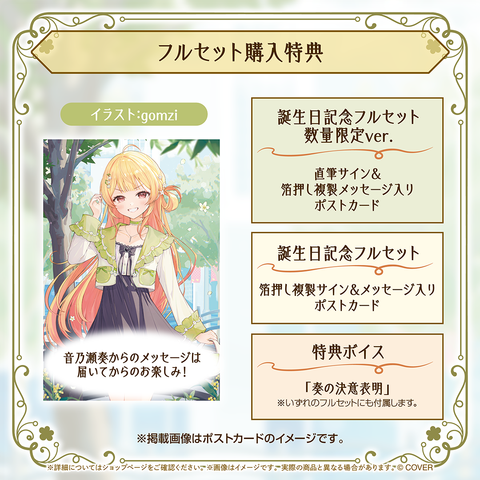 ・Bonus: A postcard with a foil-stamped autograph & message from Otonose Kanade. (Illustration: gomzi)