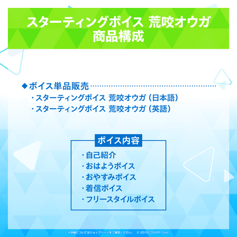 Shipping Period:Generally, the voice packs you purchase will be reflected on your ‘My Account’ page immediately after you complete the order.The "Starting Voice" of Aragami Oga from HOLOSTARS is now available!