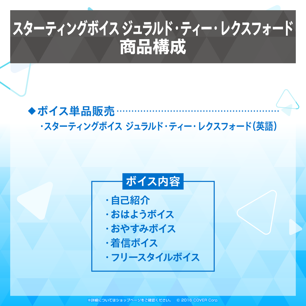 Shipping Period:Generally, the voice packs you purchase will be reflected on your ‘My Account’ page immediately after you complete the order.The "Starting Voice" of Jurard T Rexford from HOLOSTARS English is now available!