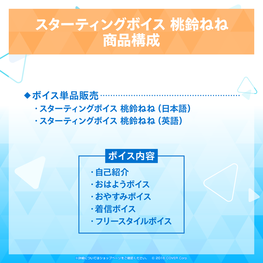 Shipping Period:Generally, the voice packs you purchase will be reflected on your ‘My Account’ page immediately after you complete the order.The "Starting Voice" of Momosuzu Nene from hololive is now available!