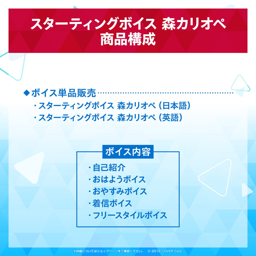 Shipping Period:Generally, the voice packs you purchase will be reflected on your ‘My Account’ page immediately after you complete the order.The "Starting Voice" of Mori Calliope from hololive English is now available!