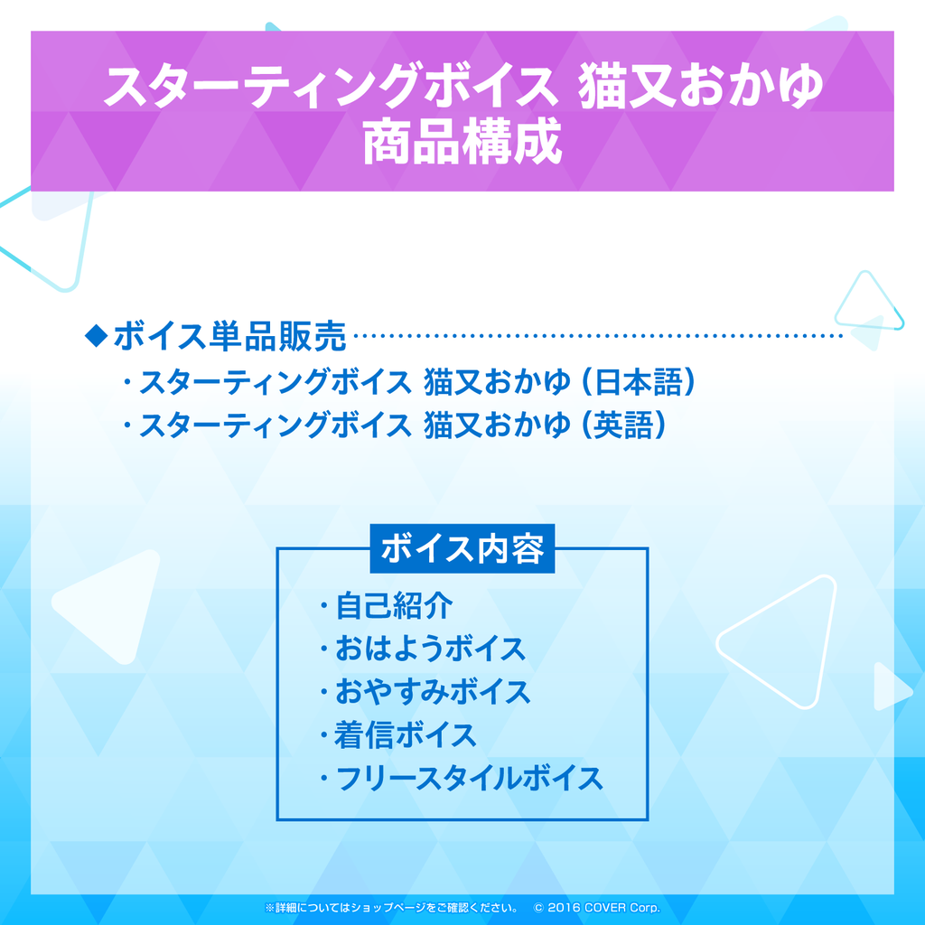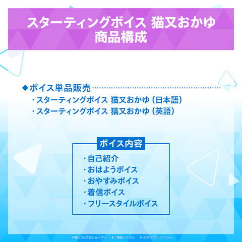 Shipping Period:Generally, the voice packs you purchase will be reflected on your ‘My Account’ page immediately after you complete the order.The "Starting Voice" of Nekomata Okayu from hololive is now available!