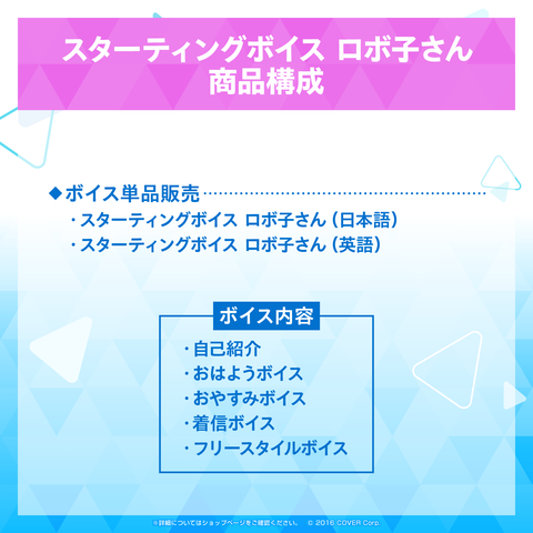 Shipping Period:Generally, the voice packs you purchase will be reflected on your ‘My Account’ page immediately after you complete the order.The "Starting Voice" of Robocosan from hololive is now available!