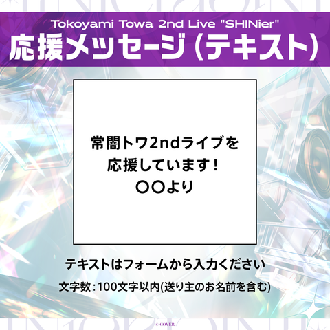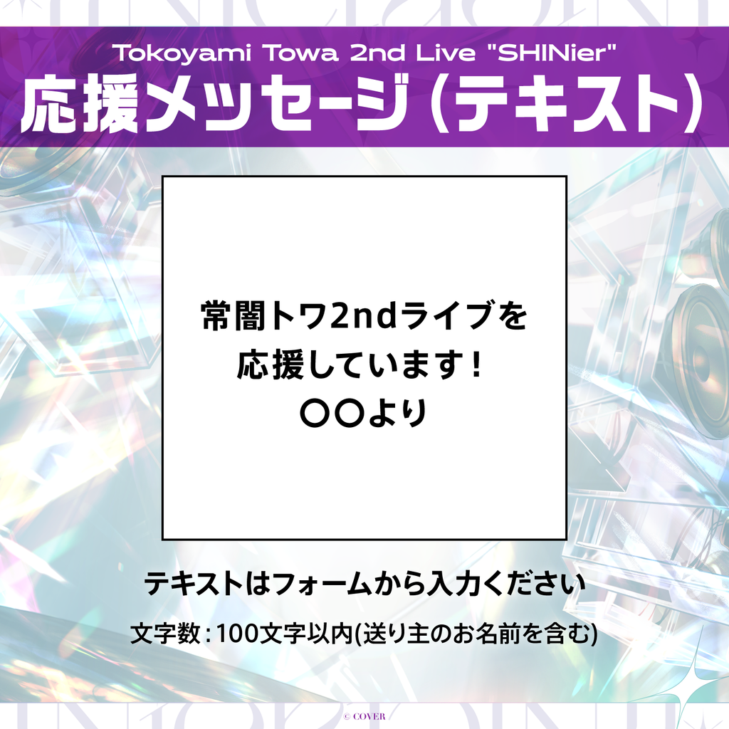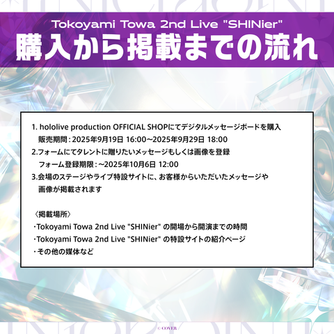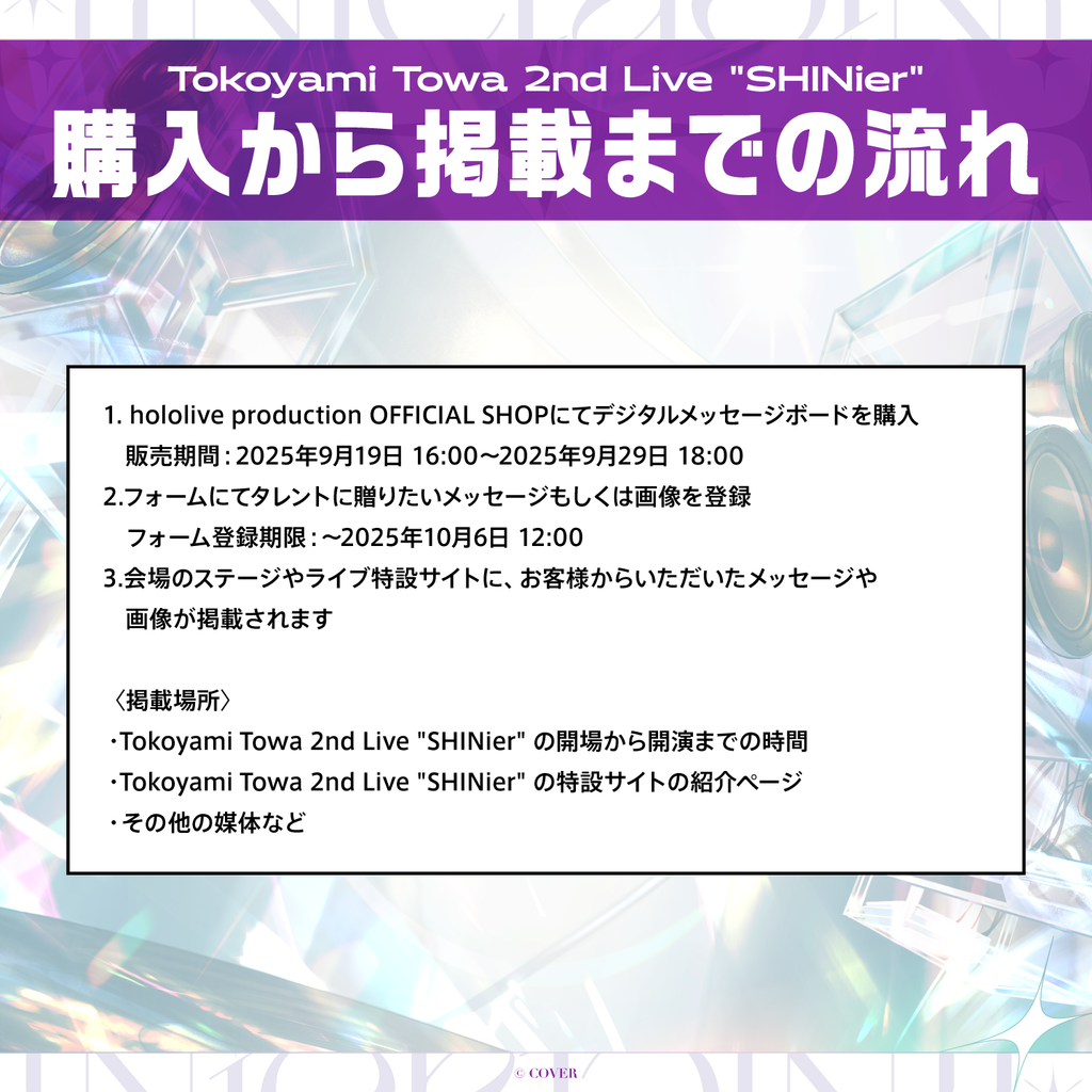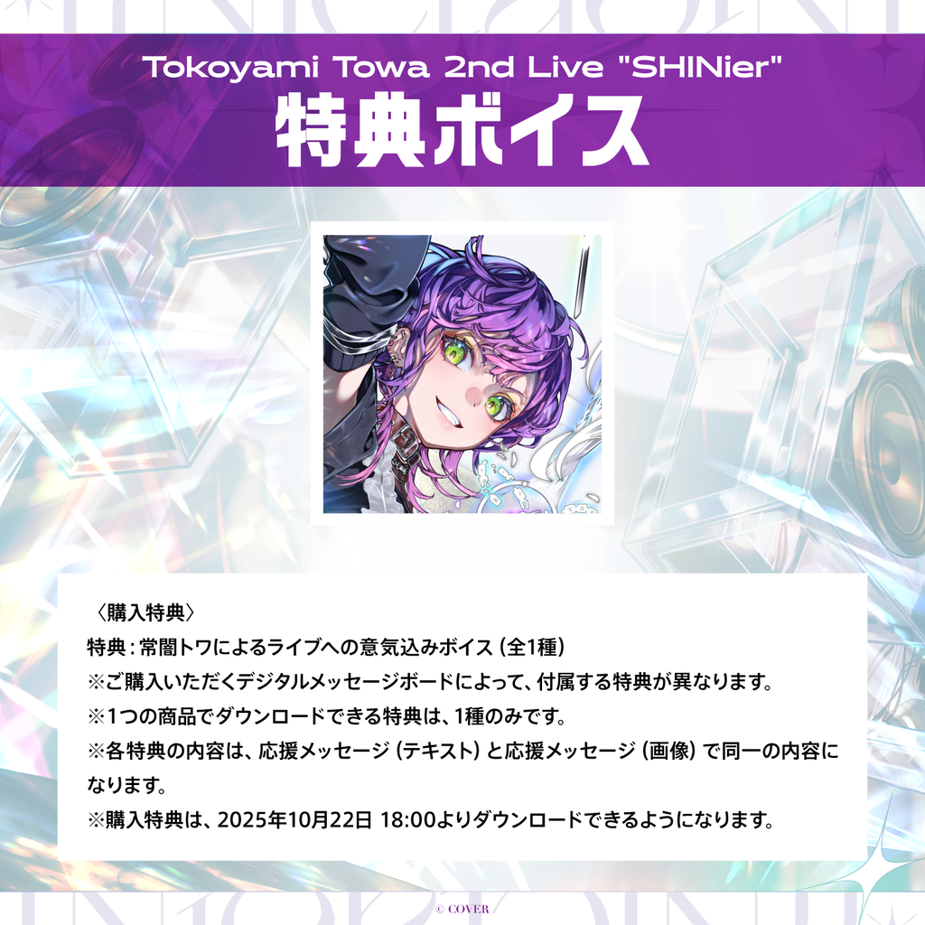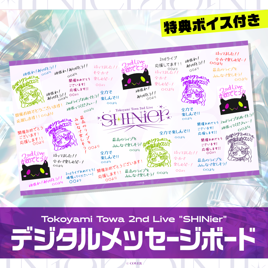 Shipping Period:As a special bonus with each purchase, you will be able to download a voice recording from Tokoyami Towa starting October 22, 2025, 18:00 (JST).Digital Message Board submissions are available for sale, allowing fans to support talent appearing at Tokoyami Towa 2nd Live "SHINier" on October 29, 2025 (JST).