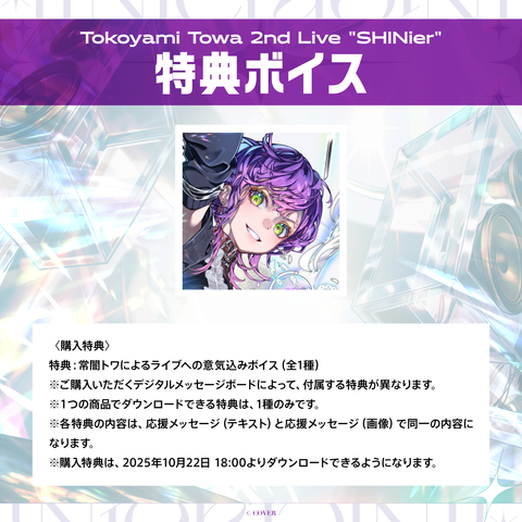 As a special bonus with each purchase, you will be able to download a voice recording from Tokoyami Towa starting October 22, 2025, 18:00 (JST).