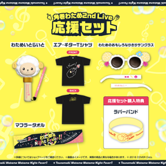 A bundle that contains Watamate Penlight, Air Guitar T-Shirt, Muffler Towel, and Watame's Gimmick Sunglasses together with a rubber wristband as the purchase bonus.