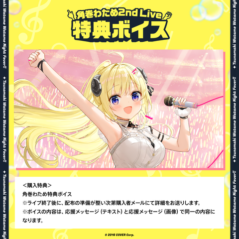 As a purchase bonus, you will be able to download a bonus voice from Tsunomaki Watame after the concert concludes.
