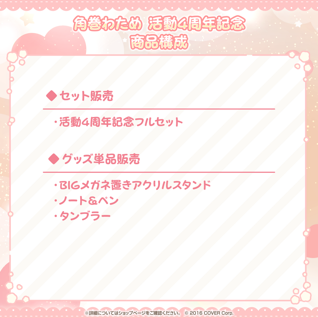 This is the complete set of the merch items to celebrate the 4th anniversary of Tsunomaki Watame.