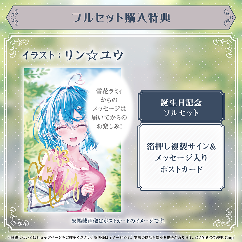 ・Bonus: Postcard with a duplicated foil-stamped autograph and message from Yukihana Lamy. (Illustration: リン☆ユウ)