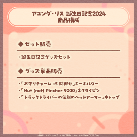 アユンダ・リスの誕生日を記念したグッズのセット商品です。