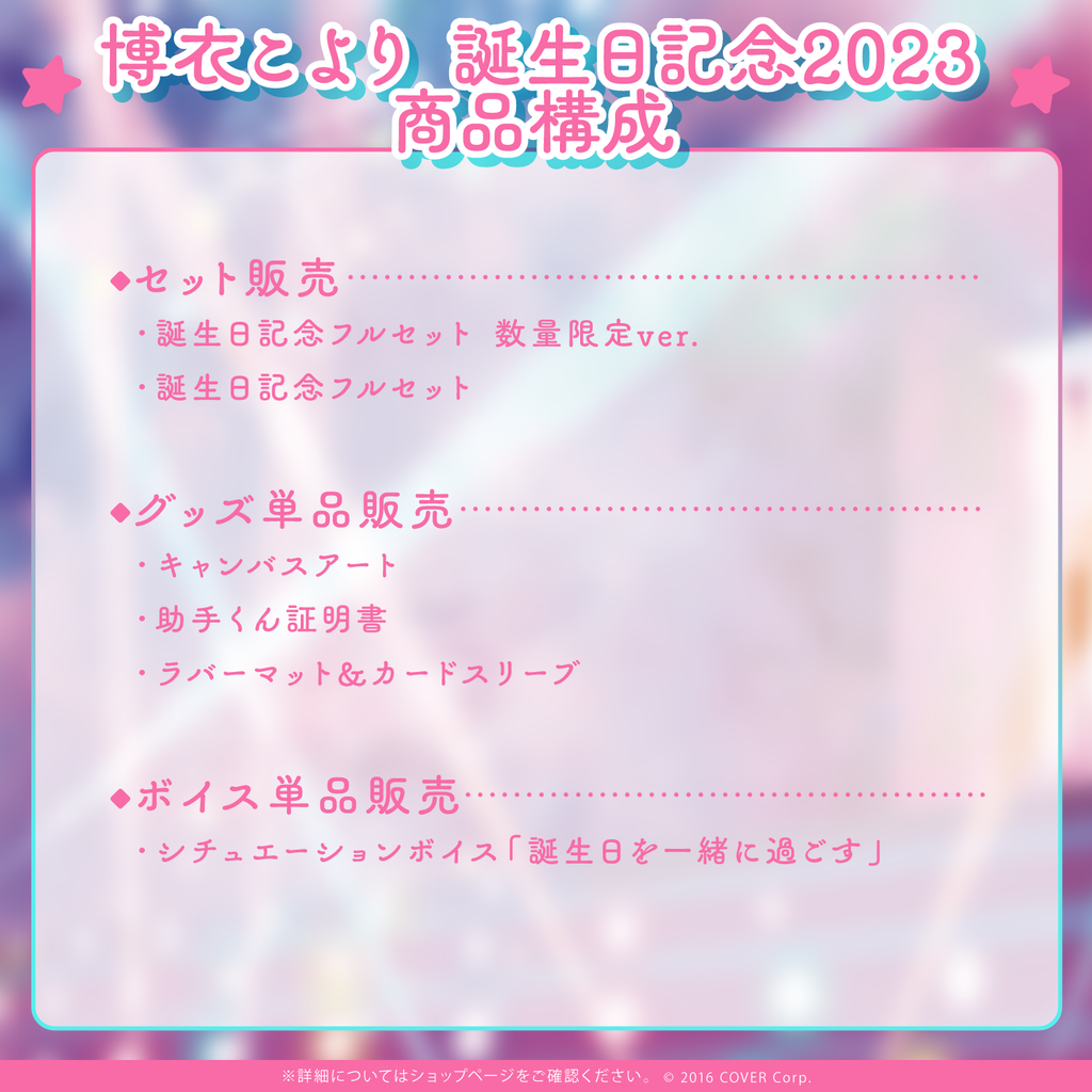 博衣こよりの誕生日を記念したフルセット商品です。