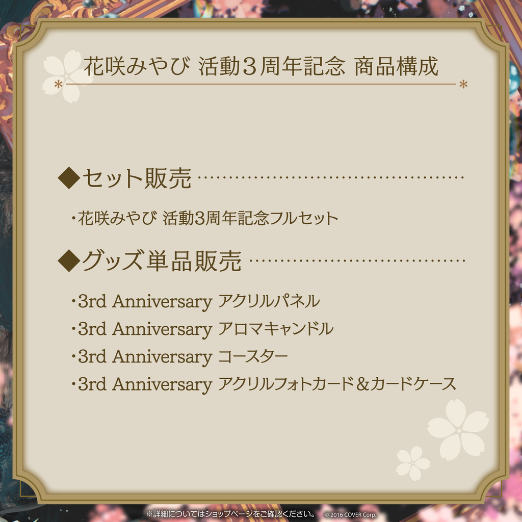花咲みやびの活動3周年を記念したフルセット商品です。