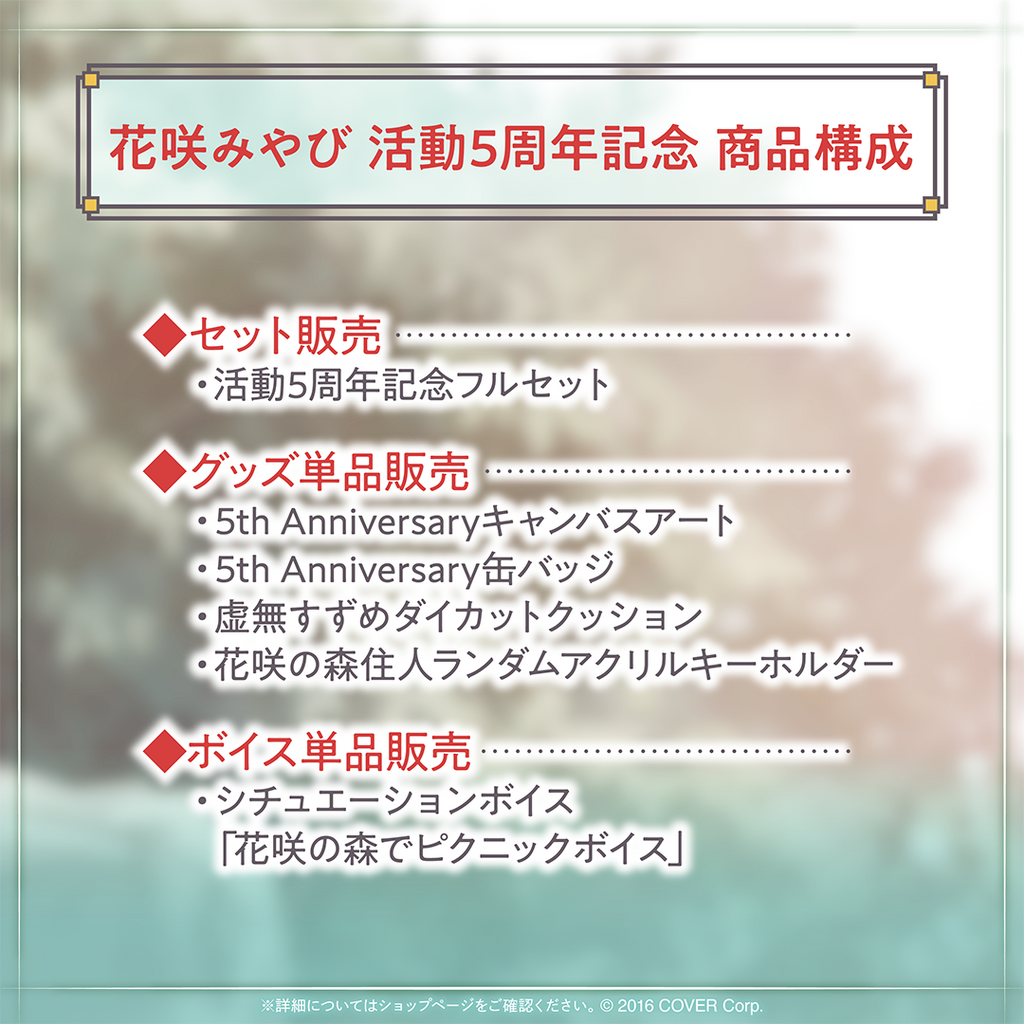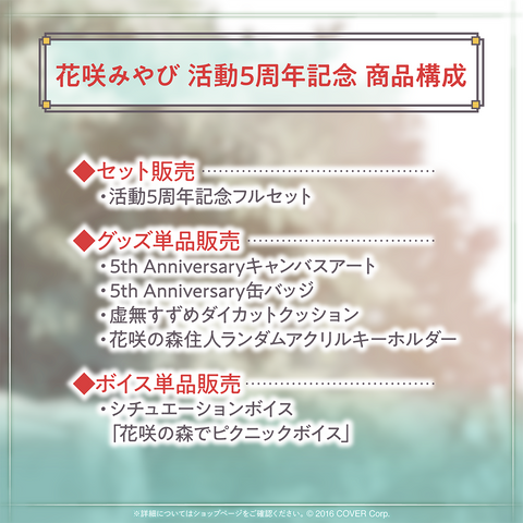 花咲みやびの活動5周年を記念したフルセット商品です。