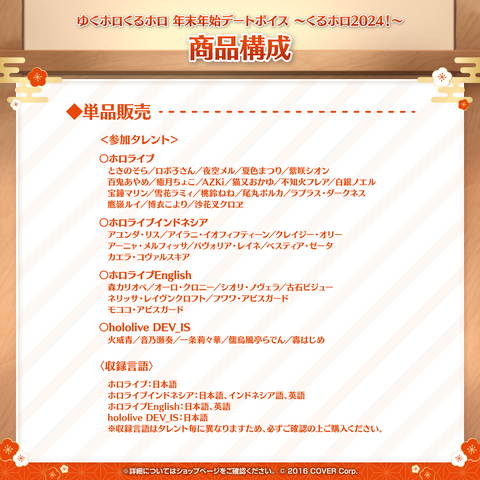 ※ホロライブインドネシア/ホロライブEnglish所属タレントのボイスには日本語台本が付属しています。