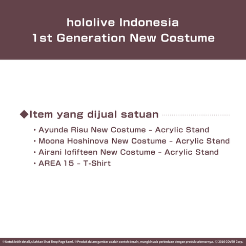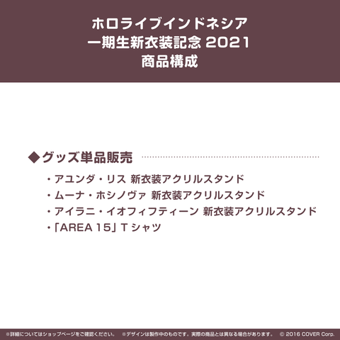 ホロライブプロダクション所属ホロライブインドネシアの「アユンダ・リス」「ムーナ・ホシノヴァ」「アイラニ・イオフィフティーン」の新衣装記念商品です。