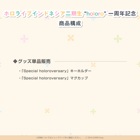ホロライブプロダクション所属ホロライブインドネシア二期生の「クレイジー・オリー」「アーニャ・メルフィッサ」「パヴォリア・レイネ」の活動一周年記念商品です。
