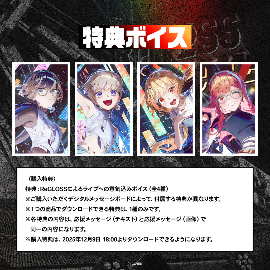購入特典として、ReGLOSS各タレントによるライブへの意気込みボイスが、2025年12月9日18:00よりダウンロードできます。