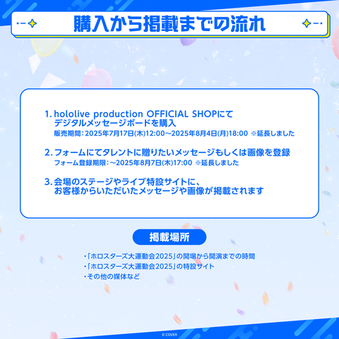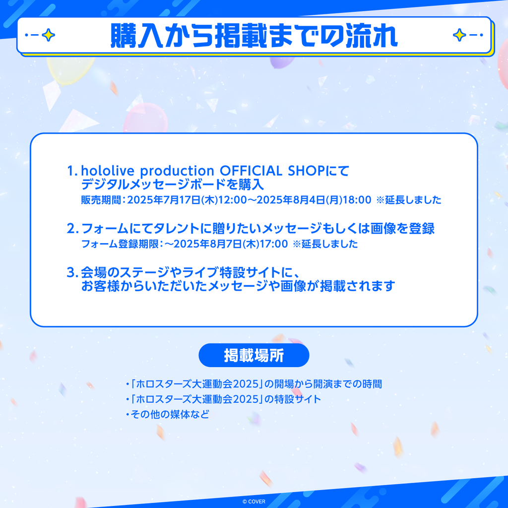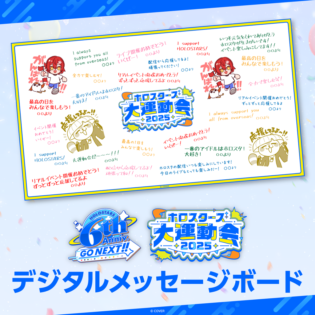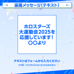 2025年9月23日(火・祝)に開催される、「ホロスターズ大運動会2025」に出演するタレントへ向けて、応援メッセージを贈ることができるデジタルメッセージボードの販売です。