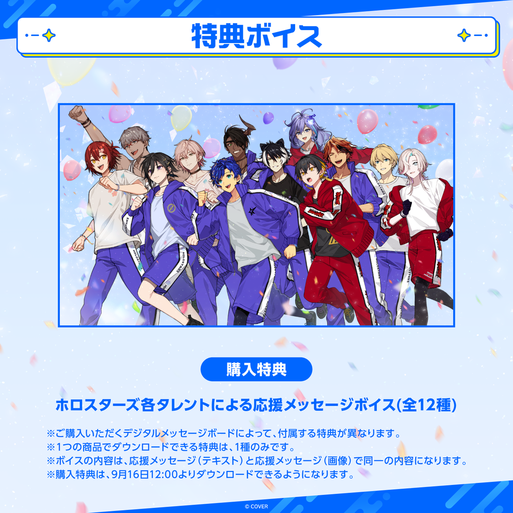 購入特典として、ホロスターズ各タレントによる特典ボイスが、9月16日(火)12:00よりダウンロードできます。